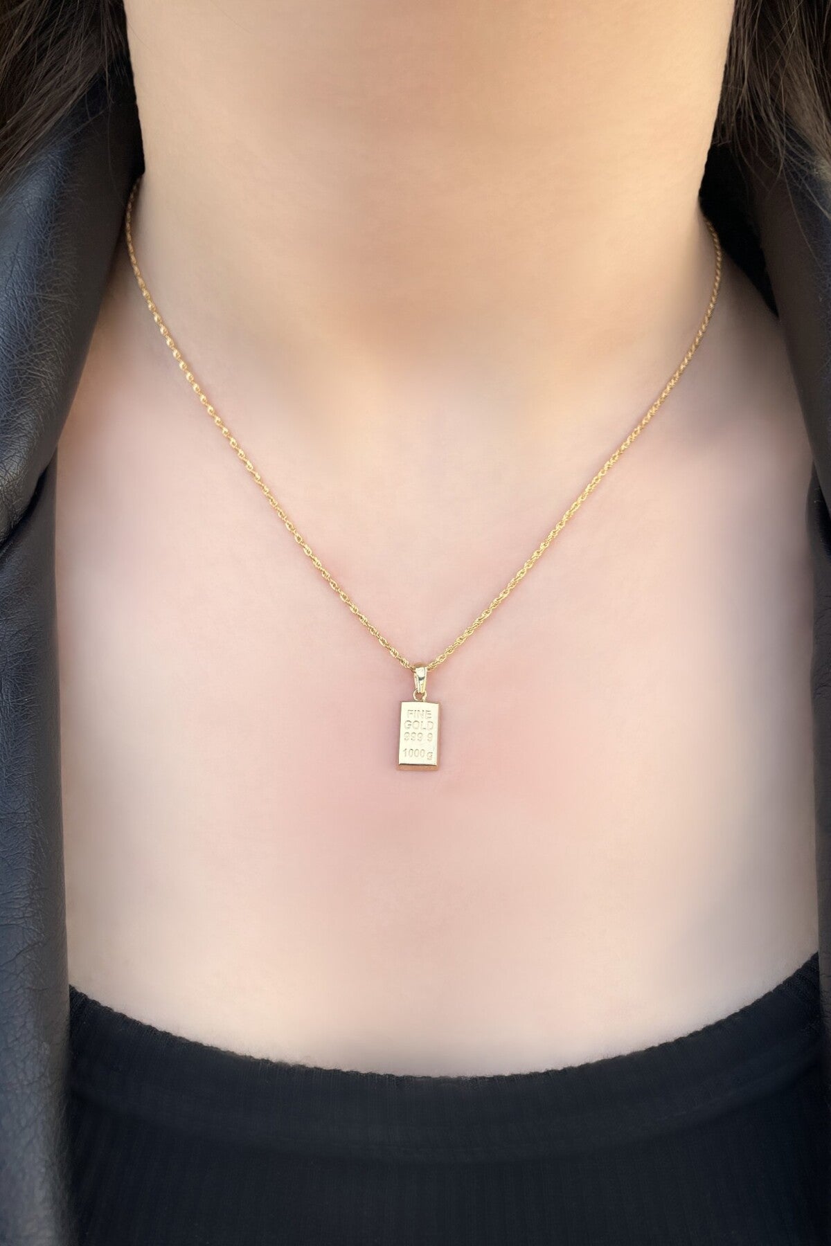 Sadece bir aksesuar değil, gücün ve prestijin sembolü! Girdiğiniz her ortamda dikkatleri üzerinize çekin. Parlaklığı ve tasarımıyla stilinizi yükseltin. Külçe altın görünümündeki bu özel tasarım kolye, hem şıklığı hem de zarafeti bir araya getiriyor. Zarif zinciri ve dikkat çekici külçe ucu ile kombinlerinize prestij katıyor.